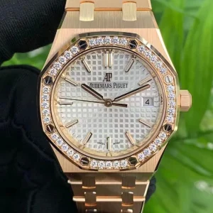 Audemars Piguet launches its first 34 mm Selfwinding Royal Oak. The silver-toned ??Grande Tapisserie?? dial of this 18-carat pink gold model is adorned with a diamond-set bezel.