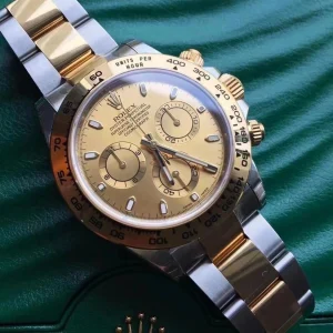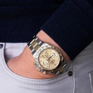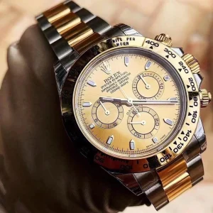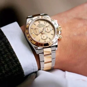 THIS OYSTER PERPETUAL COSMOGRAPH DAYTONA IN OYSTERSTEEL AND YELLOW GOLD, WITH A CHAMPAGNE-COLOUR DIAL AND AN OYSTER BRACELET, FEATURES A YELLOW GOLD BEZEL WITH ENGRAVED TACHYMETRIC SCALE.