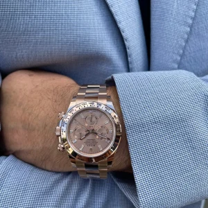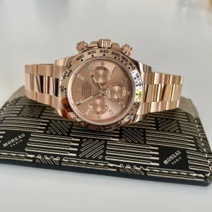 With its tachymetric scale, its three counters and its pushers, the Cosmograph Daytona was designed to be the ultimate timing tool for endurance racing drivers. The bezel features a tachymetric scale to read average speed over a given distance based on elapsed time. This scale offers optimal legibility, making the Cosmograph Daytona the ideal instrument for measuring speeds up to 400 units per hour, expressed in kilometres or miles.