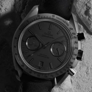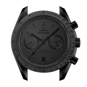 Giving this model its nickname are its brushed blackened Moonwatch-style hands and blackened applied indexes ?C all of which are coated with black Super-LumiNova. The familiar sub-dials at 3 and 9 o??clock are also matt black and the black ceramic bezel has a black lacquered tachymeter scale. At its heart is the OMEGA Co-Axial calibre 9300.