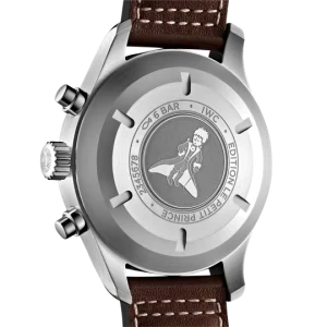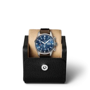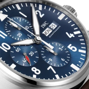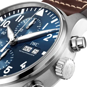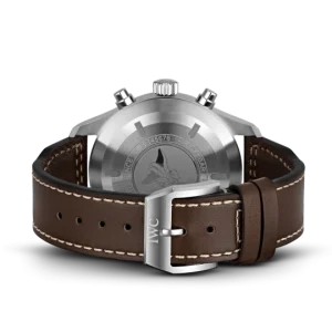 Equipped with a sturdy brown leather strap and pin buckle for added security, this timepiece features an automatic movement with date and chronograph complications, a polished steel case and a sapphire crystal protecting the blue Arabic numerals dial, whether on land or not. On the fly, this watch performs well in or out of the air.