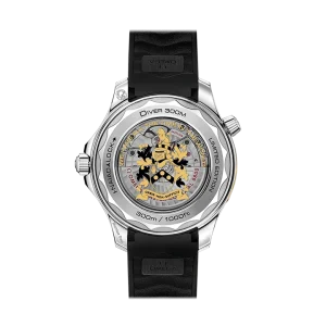 Celebrating its enduring partnership with James Bond, OMEGA has created this Seamaster Diver 300M Limited Edition timepiece presented in its own presentation box with an additional stainless steel bracelet. With only 7,007 pieces available, the 42 mm stainless steel watch has a black rubber strap and features an 18K yellow gold plate on the side of the case, engraved with each Limited Edition number.