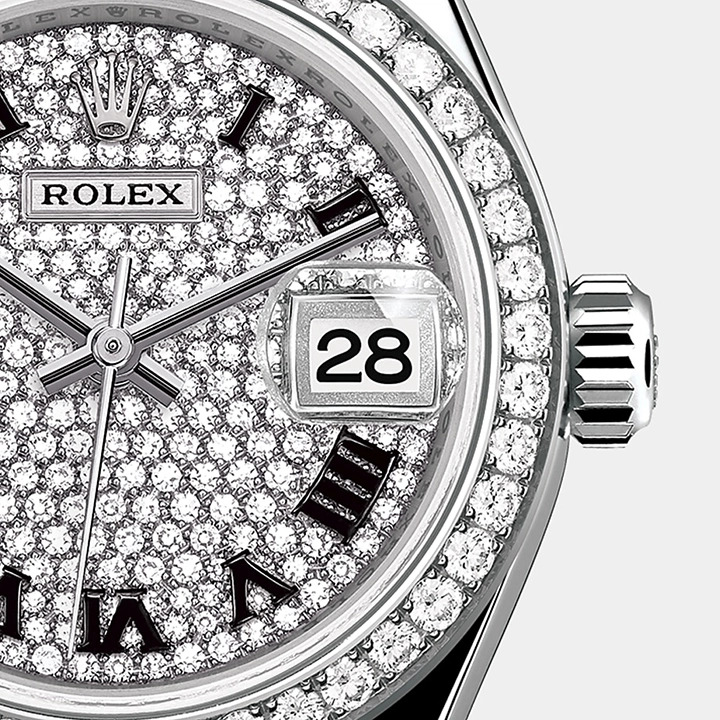 The light reflections on the case sides and lugs highlight the elegant profile of the?28 mm Oyster case, which is fitted with a?diamond-set bezel. Rolex’s classic feminine watch, the Lady-Datejust is in the lineage of the Datejust, the emblematic model that has been a byword for style and accurate timekeeping.