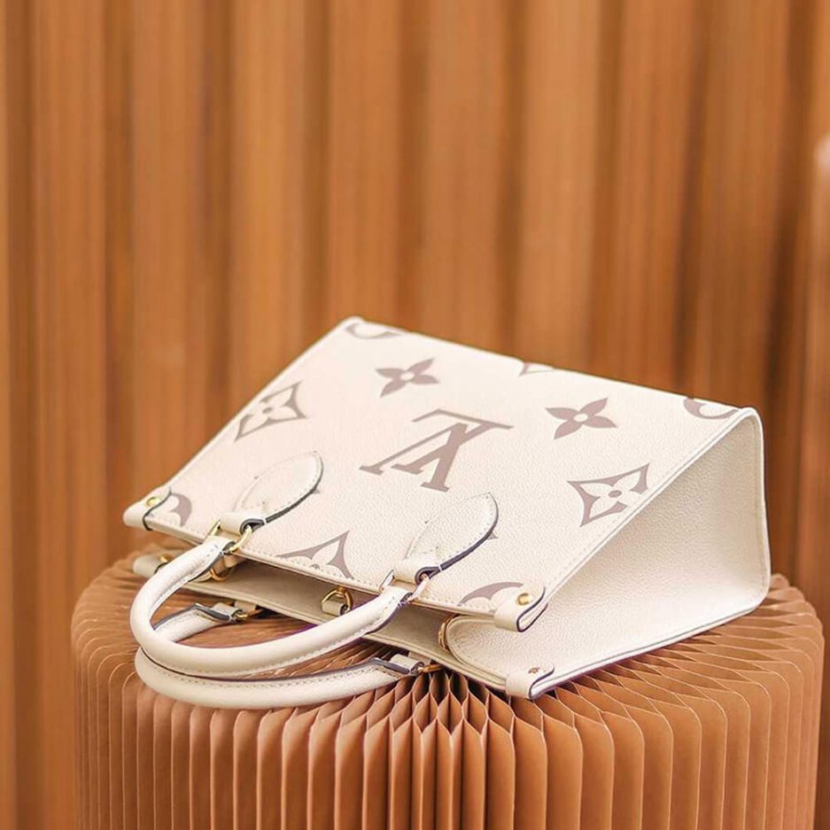 Inspired by Louis Vuitton??s famous Sac Plat from 1968, the Onthego PM tote is fashioned in Monogram Empreinte leather, embossed with a Giant Bicolor Monogram pattern. This smaller version of the original Onthego fits essentials such as an iPad Mini. Articulated top handles and an adjustable removable strap offer a variety of carry options.