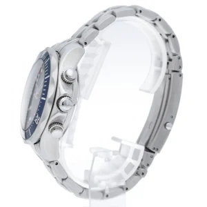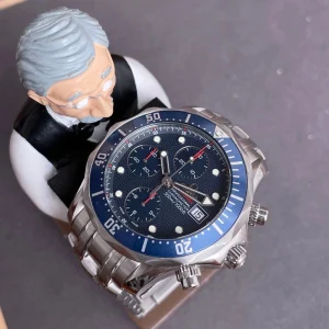This OMEGA Seamaster Diver 300M features a blue dial decorated with a wave pattern. There is a date window at the 3 o??clock position, 30-minute and 12-hour recorders and a small seconds dial. The distinctive dial is visible through a scratch-resistant sapphire crystal. The blue unidirectional rotating bezel is mounted on a 41.5 mm stainless steel case with a helium-escape valve at 10 o’clock.