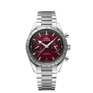 The brushed bezel includes a blackened tachymeter scale, while on the caseback, there is a ??Speedmaster ??57?? engraving as well as a flat sapphire crystal with an anti-reflective treatment inside.
