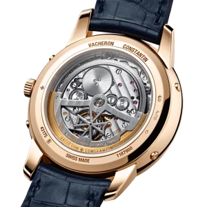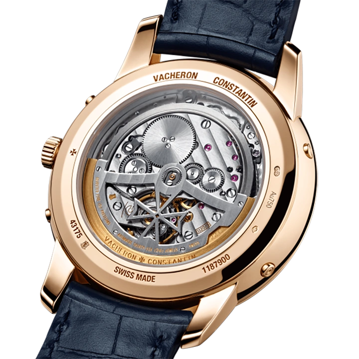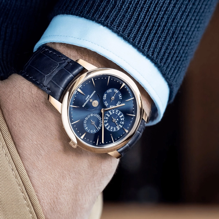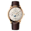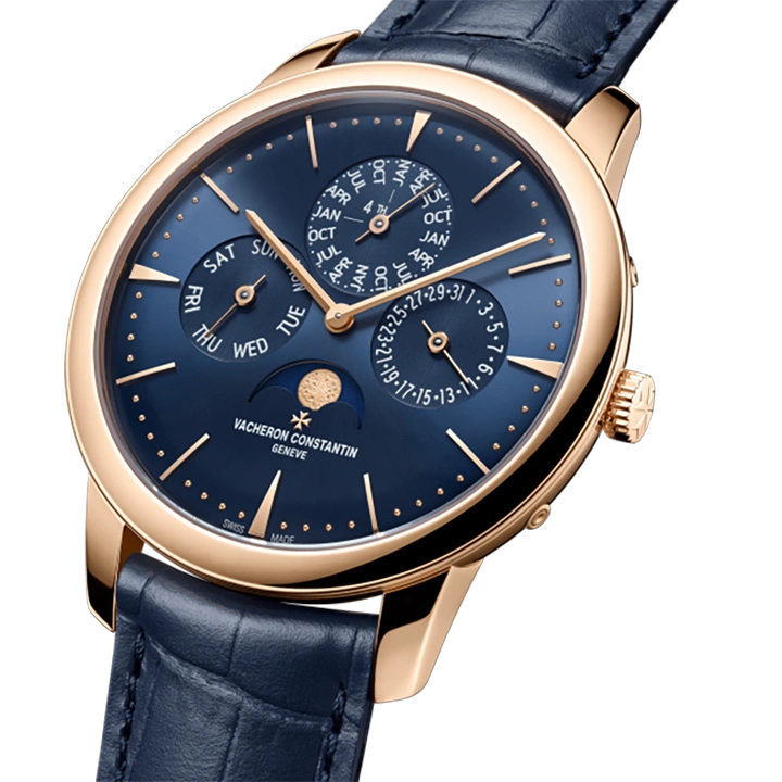 An elegant interpretation of the perpetual calendar, this 18K pink gold watch houses an ultra-slim automatic movement, just 4.05 millimeters thick, which will keep perfect time until 2100. Set at the center of its blue dial, the 18K gold moon phase features a champlev?? enamel sky and two hand-finished moons.