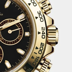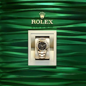 THIS OYSTER PERPETUAL COSMOGRAPH DAYTONA IN 18 KT YELLOW GOLD, WITH A BLACK DIAL AND AN OYSTER BRACELET, FEATURES 18 KT YELLOW GOLD BEZEL WITH ENGRAVED TACHYMETRIC SCALE.