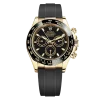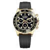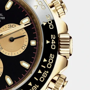 THIS OYSTER PERPETUAL COSMOGRAPH DAYTONA IN 18 KT YELLOW GOLD WITH AN INTENSE BLACK AND CHAMPAGNE-COLOUR DIAL AND AN OYSTERFLEX BRACELET, FEATURES A BLACK CERACHROM BEZEL WITH TACHYMETRIC SCALE.