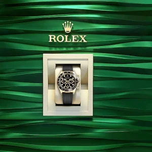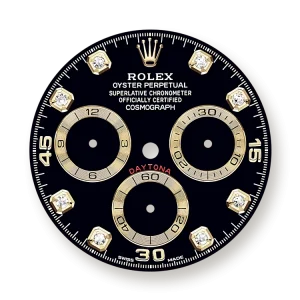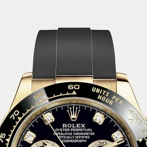 THIS OYSTER PERPETUAL COSMOGRAPH DAYTONA IN 18 CT YELLOW GOLD WITH A BLACK, DIAMOND-SET DIAL AND AN OYSTERFLEX BRACELET, FEATURES A BLACK CERACHROM BEZEL WITH TACHYMETRIC SCALE.