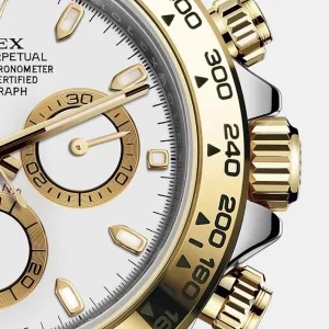 THIS OYSTER PERPETUAL COSMOGRAPH DAYTONA IN OYSTERSTEEL AND YELLOW GOLD, WITH A WHITE DIAL AND AN OYSTER BRACELET, FEATURES A YELLOW GOLD BEZEL WITH ENGRAVED TACHYMETRIC SCALE.