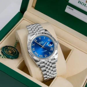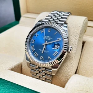 THIS OYSTER PERPETUAL DATEJUST 41 IN OYSTERSTEEL AND WHITE GOLD FEATURES AN AZZURRO-BLUE DIAL AND A JUBILEE BRACELET.