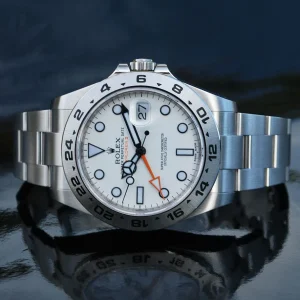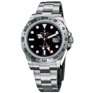 This Oyster Perpetual Explorer II in Oystersteel with an Oyster bracelet features a white dial with an arrow-shaped 24-hour hand and hour markers with a Chromalight display.
