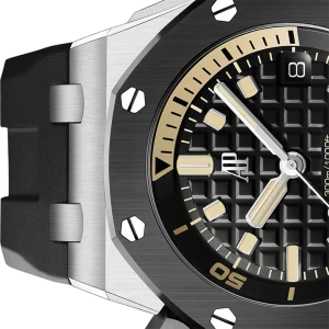 Black dial with ??M??ga Tapisserie?? pattern, pink gold applied hour-markers and Royal?Oak hands with luminescent coating, black rotating inner bezel. with zone from 60 to 15 minutes in beige.