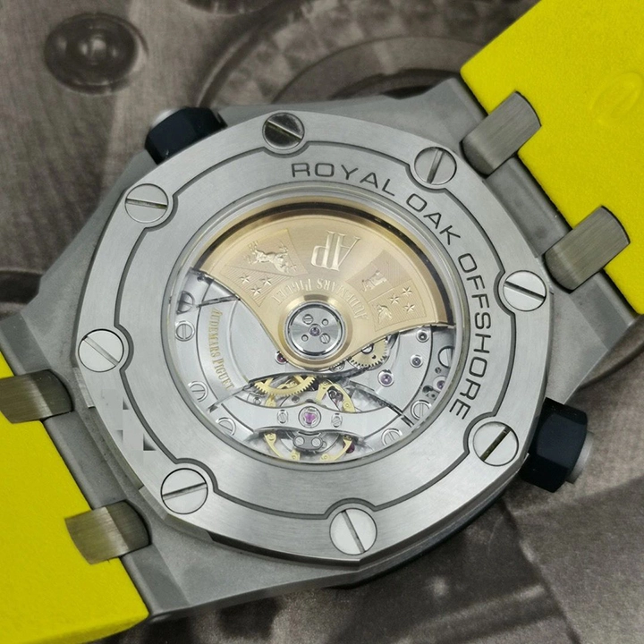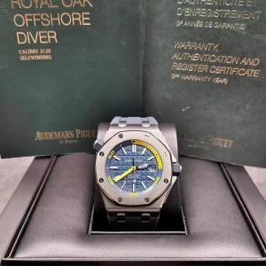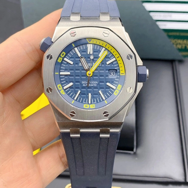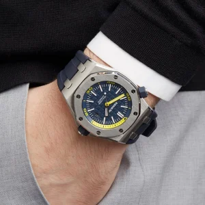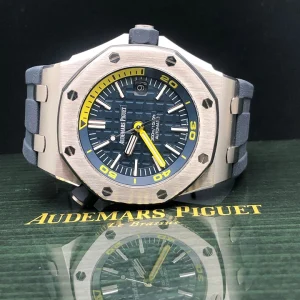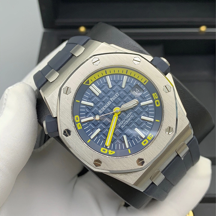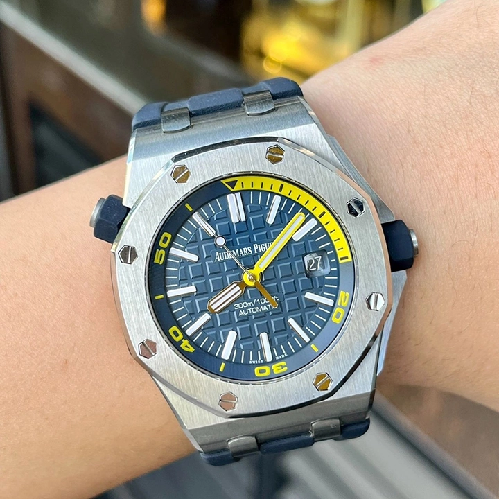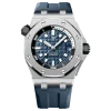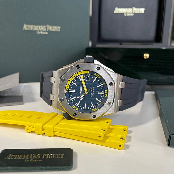 Blue dial with ??M??ga Tapisserie?? pattern, white gold applied hour-markers and Royal Oak hands (yellow minutes hand) with luminescent coating, blue rotating inner bezel with diving scale and zone from 60 to 15 minutes in yellow.