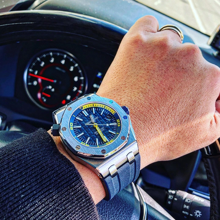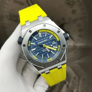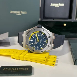 The sleek dark-blue Royal Oak Offshore Diver in the new ??Funky Colour?? collection, with easy to switch out rubber straps in blue or yellow.?