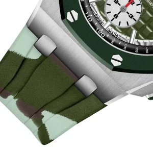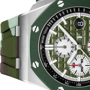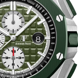 Khaki green dial with ??M??ga Tapisserie?? pattern, rhodium-toned counters, rhodium-toned external zone, white gold applied hour-markers and Royal Oak hands, black inner bezel.