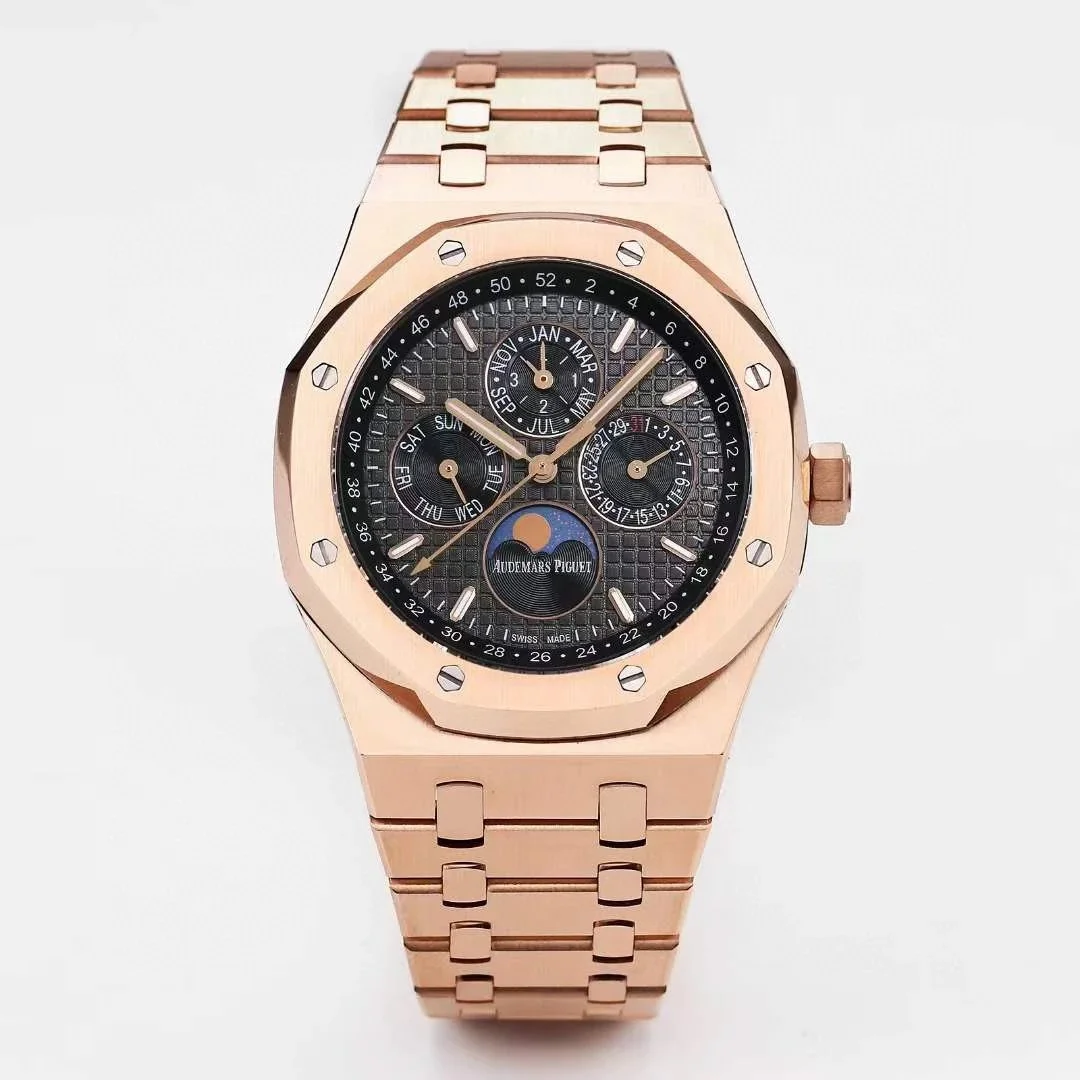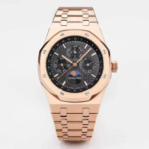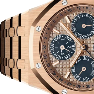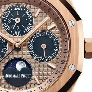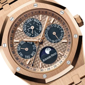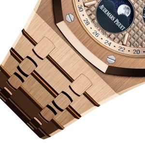 Pink gold-toned dial with ??Grande Tapisserie?? pattern, blue counters, pink gold applied hour-markers and Royal Oak hands with luminescent coating, pink gold-toned inner bezel.