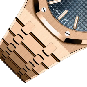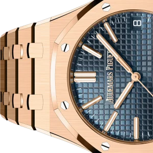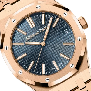 This 18-carat pink gold 41 mm Royal Oak Selfwinding is enriched with a Grande Tapisserie dial in the iconic Bleu Nuit, Nuage 50 shade of the 1972 model. It also showcases the collection??s new design evolution.