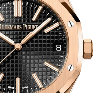 Black dial with ??Grande Tapisserie?? pattern, pink gold applied hour-markers and Royal?Oak hands with luminescent coating.