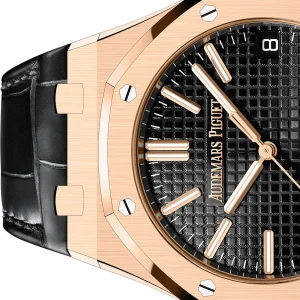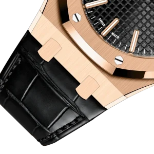 This 18-carat pink gold Royal Oak Selfwinding in 41 mm is endowed with the new design evolution and sports a black Grande Tapisserie dial and a matching alligator strap.