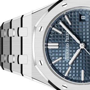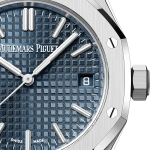 This 37 mm timepiece is inspired by the original Royal Oak from 1972 with its body of steel and its Bleu Nuit, Nuage 50 Tapisserie dial. Yet looking to the future, it presents the new Royal Oak ergonomic design as well as the new selfwinding Calibre 5900, fitted with the “50-years” oscillating weight.
