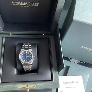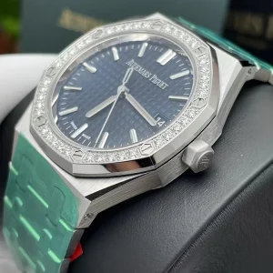 The 34 mm stainless steel anniversary model is illuminated by a Bleu Nuit, Nuage 50 Grande Tapisserie dial encircled by a diamond-set bezel. The piece also features the new Royal Oak design evolution and the rhodium-toned ??50-years?? oscillating weight.