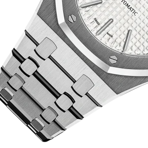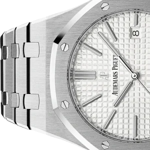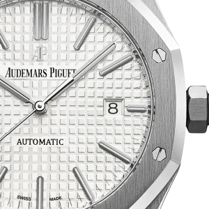 Silver-toned dial with ??Grande Tapisserie?? pattern, white gold applied hour-markers and Royal Oak hands with luminescent coating