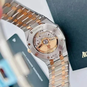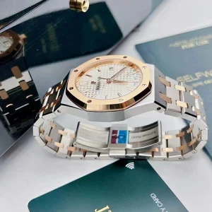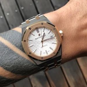 The slender, architectural form of the Royal Oak is outlined in a 37 mm case size and a two-tone material mix: steel and 18-carat pink gold. A pink gold-toned ??Grande Tapisserie?? dial beautifully underlines the design of this horological icon.